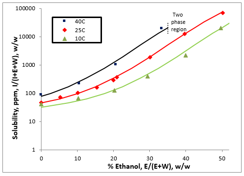 The solubility measurements of Ibu in various compositions of solvent at 10, 25 and 40 °C are summarised in table 1, where maximum Ibu solubility (67450 ppm) was obtained in 50.19% w/w ethanol at 25 °C. Similar solvent ethanolic solvent (49.67%w/w) showed Ibu solubility of 20410 pm at 10 °C. At 40 °C, maximum Ibu solubility (6525 ppm) was observed in 29.9% ethanol and no experiments were conducted at above 30% aqueous ethanol solvent as phase separation occurred above this concentration (fig. 2). Therefore, in this study, all solubility experiments were carried out at 25 °C. The obtained data are presented in fig. 3, which showed consistency with the prior data of [18]) who studied at higher ethanol contents.