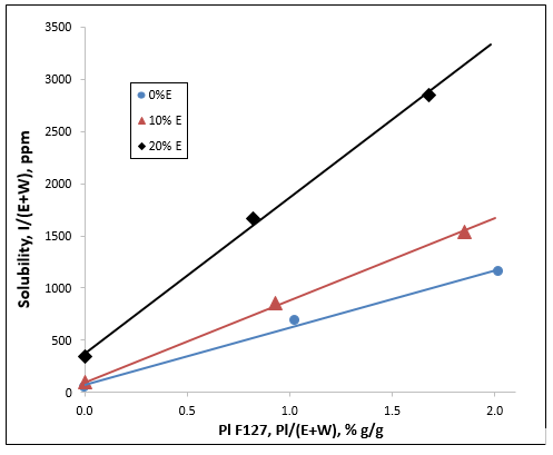 where, Sol is the solubility of Ibu (as I/(E+W) in ppm) in the presence of excipients, Sol0 is the solubility in the absence of excipients (as given by equation 1) and [E] and [Pl F127] are the concentrations of ethanol and Pl F127 (as % g/g solvent), respectively.