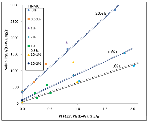 Where, Sol is the Ibu solubility (as I/(E+W) in ppm) in the presence of excipients, Sol0 is that in the absence of excipients (as given by equation 3) and [E], [Pl F127] and [HPMC] are the concentrations of ethanol, Pl F127 and HPMC, respectively as % g/g to solvent.