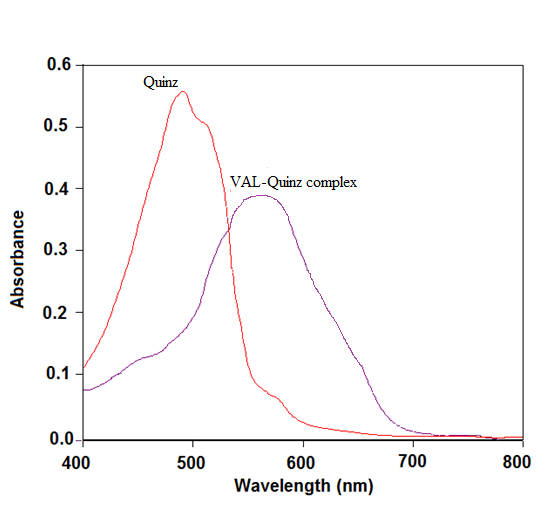 In the present work, we developed a simple, sensitive, rapid, accurate and validated spectrophotometric method for the determination of VAL in pure form and pharmaceutical formulations. The proposed method involves the formation of a charge transfer complex between VAL and two alizarin derivatives; quinalizarin (Quinz) and alizarin red S (ARS) as chromogenic reagents. The proposed methods have been validated statistically for their accuracy, precision, sensitivity, selectivity, robustness, and ruggedness as per ICH guidelines [38].
