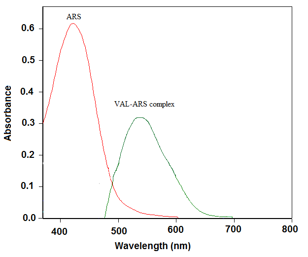 Fig. 3: Absorption spectra for the reaction product of (20 μg/ml) VAL against (0.2%, w/v) ARS reagent blank solution