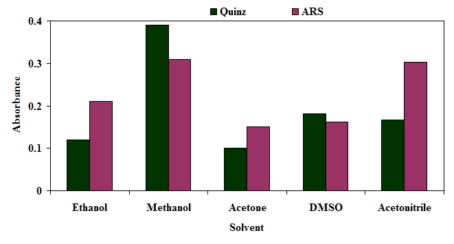 Fig. 4: Effect of different solvents on the charge transfer complex formation obtained against (0.2%, w/v) Quinz or ARS solutions also prepared in each solvent. VAL drug concentration; (16 and 20 μg/ml) for Quinz and ARS, respectively