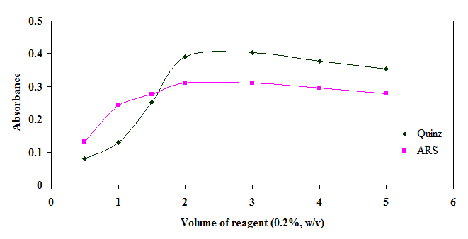 In order to achieve this objective, an experiment was performed by varying the concentration of the reagent in the range of 0.5-5.0 ml of (0.2%, w/v) Quinz and ARS solutions, while the VAL concentration was maintained constant. As it can be seen, remarkable increase of the absorbance was verified up to 2.0 ml of (0.2% w/v) Quinz and ARS reagents, respectively, after this point, the absorbance remain constant (fig. 5). Therefore, 2.0 ml of (0.2%, w/v) Quinz and ARS reagents, is a sufficient and optimum reagent volume.