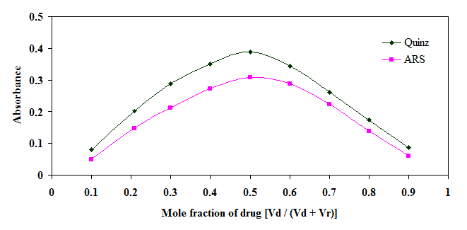 Fig. 6: Application of Job’s method to the reaction between VAL and Quinz and ARS reagents