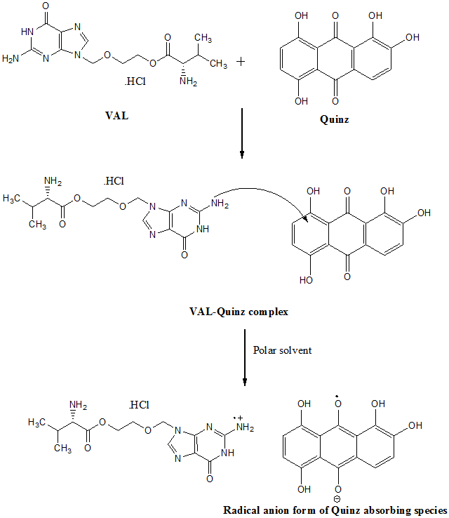 Molecular charge-transfer complexes are formed in non-polar solvents while radical anion species are predominant in polar solvents [33-37]. Also, it is believed that the addition of basic compounds that contains a lone pair of electrons, such as VAL results in the formation of charge-transfer complexes of n-π type (Scheme 1). This kind of complexes can be considered an intermediate molecular-association compound that forms a corresponding radical anion in polar solvents. In this case, radical anions results.