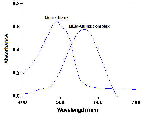 Fig. 2: Absorption spectra of Quinz and the reaction product of MEM (24 μg/ml) in methanol