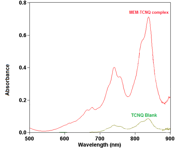 The dissociation of the (D–A) complex was promoted by the high ionizing power of the polar solvent and the resulting peaks in the absorption spectra of MEM-acceptor reaction mixtures were similar to the maxima of the radical anions of the acceptors (Quinz.-, p-CA.-and TCNQ.-) obtained by the iodide reduction method [39].