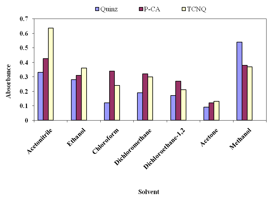 Acetone, methanol, ethanol, methylene chloride, 1,2-dichloroethane, DMSO, acetonitrile, and chloroform were among the solvents tested. Because it has a high relative permittivity, acetonitrile was determined to be the optimum solvent for both p-CA and TCNQ, ensuring the highest yield of p-CA and TCNQ species (fig. 5). In methanol or ethanol, the production of p-CA.-and TCNQ.-radicals was possible, although the colour intensity was lower than in acetonitrile. Quinz found that methanol had the best sensitivity, despite the fact that DMSO and acetonitrile had the highest dielectric constants. This is likely due to methanol's ability to form stable hydrogen bonds with the radical anion. Then, for additional testing, methanol was chosen.