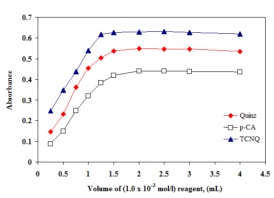 The results for varying reagent concentrations revealed that 2.0 and 1.5 ml of (1.0 × 10-3 mol/l) (Quinz or p-CA) and TCNQ, respectively, are the best volumes for producing maximal and repeatable colour intensity for MEM in acetonitrile (fig. 6). Higher reagent concentrations had no effect on the colour intensity.
