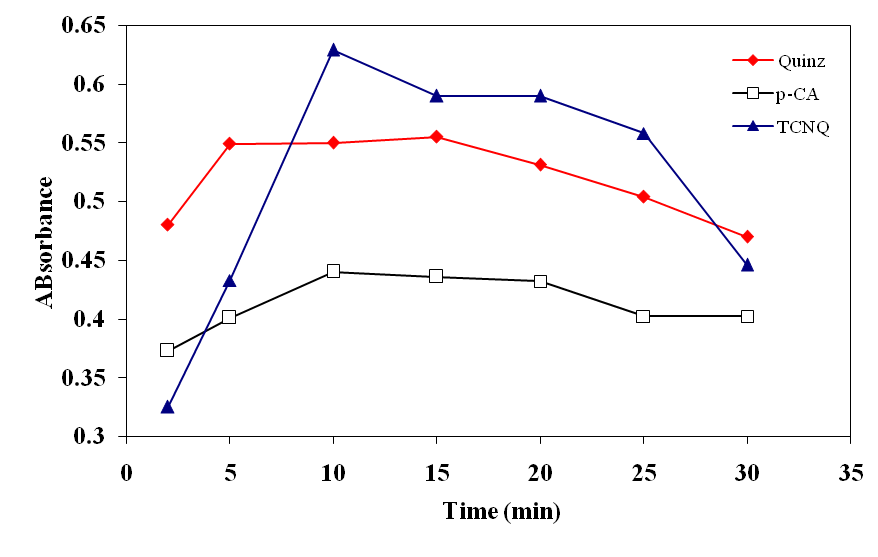 Fig. 7: Effect of time on the absorbance of charge transfer complexes formed between MEM and acceptors (1.0 × 10-3 mol/l)