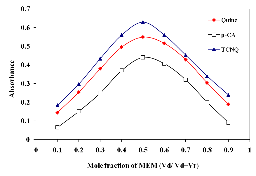 Fig. 8: Continuous variation plots for the reaction of MEM with Quinz, p-CA and TCNQ. λ= 558, 532 and 840 nm, respectively. Total molar concentration = 1.0 x 10-4 mol/l