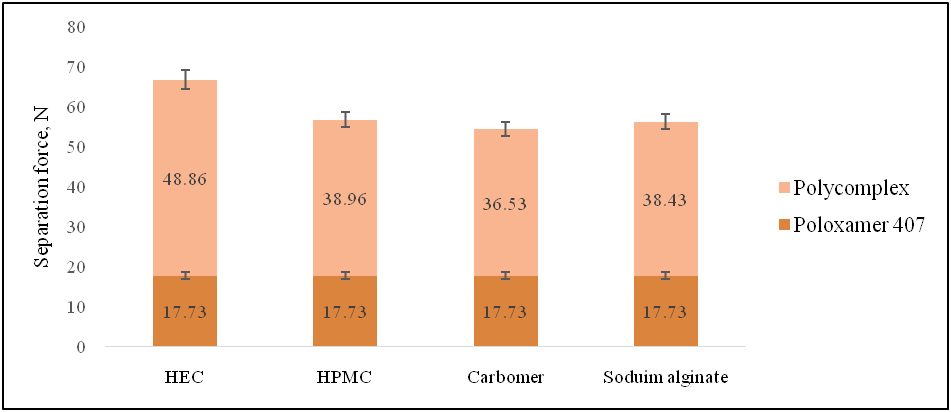 It is known that the mechanism of interaction between mucose and adhesive polymers is based on bonding, mainly due to the emerging hydrogen and Van der Waals bonds [18]. The mucoadhesive properties of polymers are influenced by such characteristics as molecular weight, the flexibility of polymer chains, the nature of the three-dimensional structure, and polymer concentration. In preliminary studies of the mucoadhesive properties of individual commercially available, the average (n=5) values of mucoadhesion determined in the separation force experiment conducted under conditions similar to this study were determined polymers [17, 18]. For 2.0% (by weight) in polymer solutions, the separation forces from the mucin layer were: HEC-24.59 N, HPMC-21.84 N, carbomer-23.38 N, sodium alginate-20.43 N. It should be noted that the studied polymers have similar values of mucoadhesion. However, for a polymer of the Natrosol ® 250 HHX brand in a thermo-reversible complex with poloxamer 407, the value of mucoadhesion for separation is 1.2-1.3 times higher than other binary complexes studied. To find out the cause of this phenomenon and to study the contribution of the properties of individual polymers to the amount of mucoadhesion of the complex, additional research is necessary.