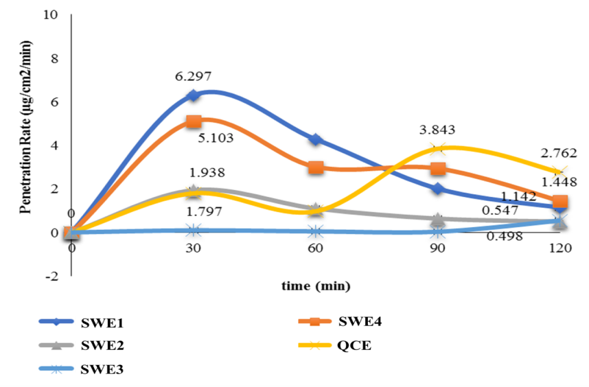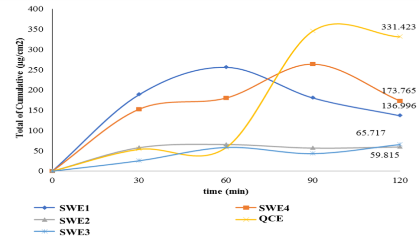 The diffusion test parameters in the present work consisted of the cumulative compound penetration (Q) and fluxes (J). The amount of cumulative penetration for SWE1, SWE2, SWE3, and SWE4 are displayed in fig. 2 and 3. According to the curve, we can see the concentration of penetrant enhancer DMSO in the sesewanua extract emulgel formula, compared to SWE1, contributes to an increase in the quercetin of the emulgel passed through the membrane. Jatav et al., [38] show that such an increase in DMSO can lead to a rise in the cumulative penetration amount of active, hydrophilic substances. DMSO is capable of speeding up drug penetration, either hydrophilic or lipophilic, by its mechanisms of extracting the fat layer through the transcellular pathway. The process results in the replacement of the bonding of water through the intracellular pathway. Consequently, the quercetin possessing polar properties can pass through the skin layer, precisely the thick stratum corneum, through two different pathways [39, 40].
