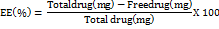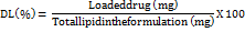 About 10 ml of SLN centrifuged at 10,000 rpm, 20 min at 25 °C (Remi InstPvt. Ltd, India) followed by isolation of lipid portion and evaluated at spectrophotometrically at λmax263 nm (Shimadzu 1800, Japan). The %ENE calculated as follows