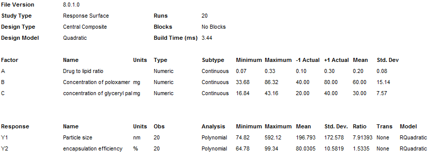It was necessary to employ a statistical experiment design methodology in order to optimize the formulation and process variables of the SLNs. CCD is the best strategy to allocate each variable to a range of evaluations while obtaining a consistent curvature judgment to attain rational information to test for “lack-of-fit” by rationalized number of design points [13, 14]. After selecting the critical variables affecting particle size (PLS), encapsulation efficiency (ENE), the response surface methodology (RSM), followed by CCD were employed to optimize these variable levels. The study is novel in that it successfully prepared and characterized a non-lipidic, temperature degradable low soluble nilotinib anti-cancer drug into an SLN carrier newly using central composite design for optimization, as well as shown enhanced solubility of the same.