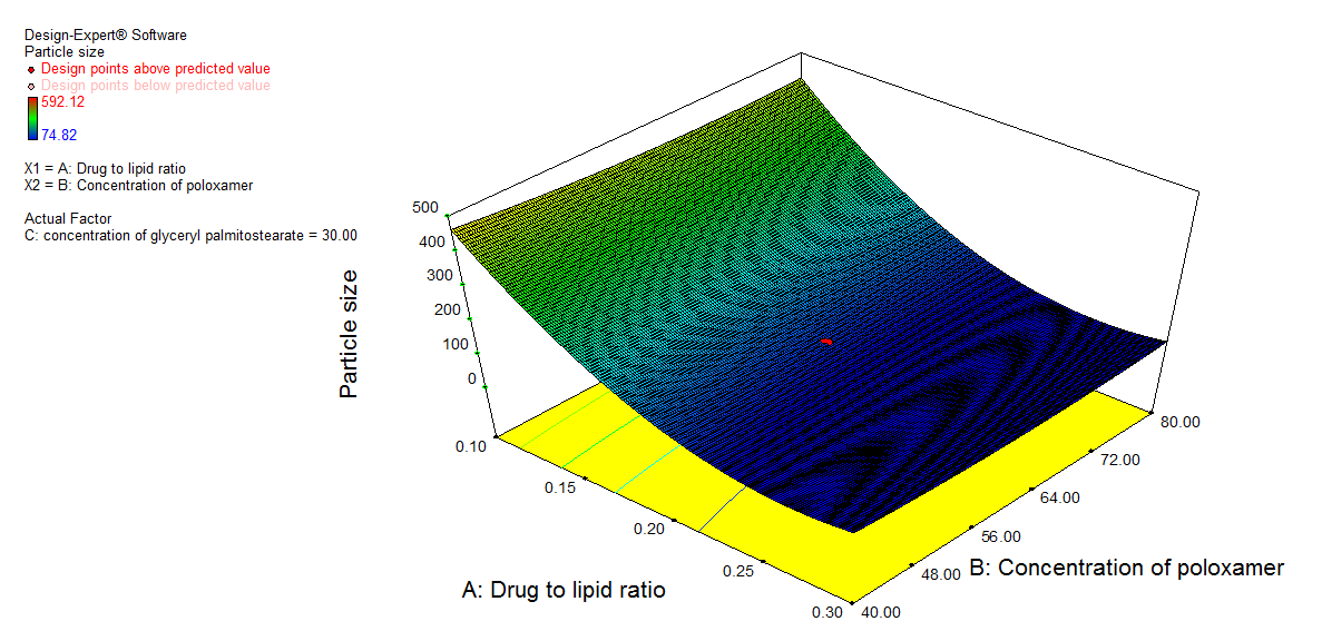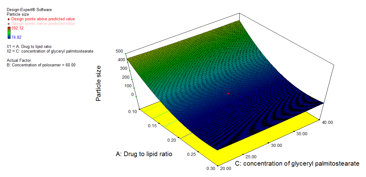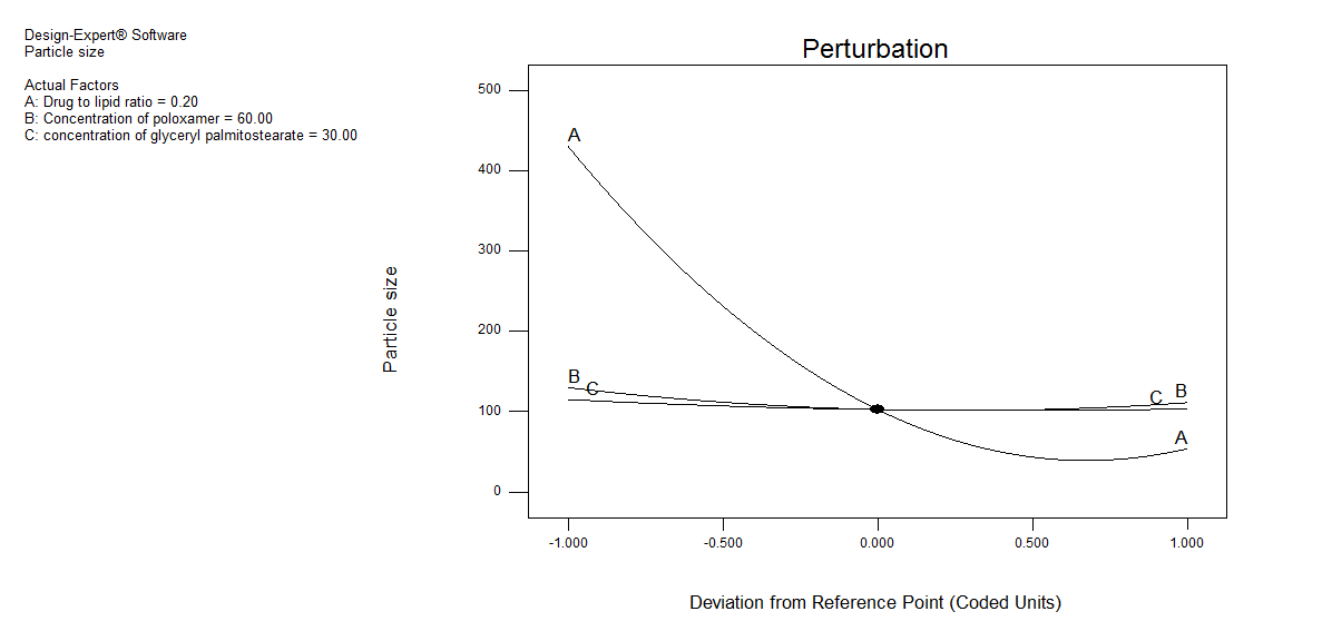 According to table 2, the PLS ranged between74.2-592.12 nm. In the statistical analysis generated for PLS (Y1), it was determined that the model is significant with an F-value of 810324(table 3). Using the PBP, 3D RSP and CP plots the main and interactive effects of IDV are revealed. A has the largest impact on Y1 followed by B and C, which have a moderate effect. As the ratio of drug to lipid decreases, the wavelength of Y1 augments from 428.56 nm to 481.84 nm. A high level of A results in Y1 increasing from 74.82 nm to 82.43 nm. As the amount of B decreases, Y1 decreases from 481.84 nm to 80.98 nm. In the same way, at high level of B, Y1 decreases from 449.86 nm to 74.8 when levels of C are low, Y1 decreases from 481.84 nm to 76.87 nm.87 nm. As well, at high level of C, Y1 decreases from 460.48 nm to 74.82 nm.