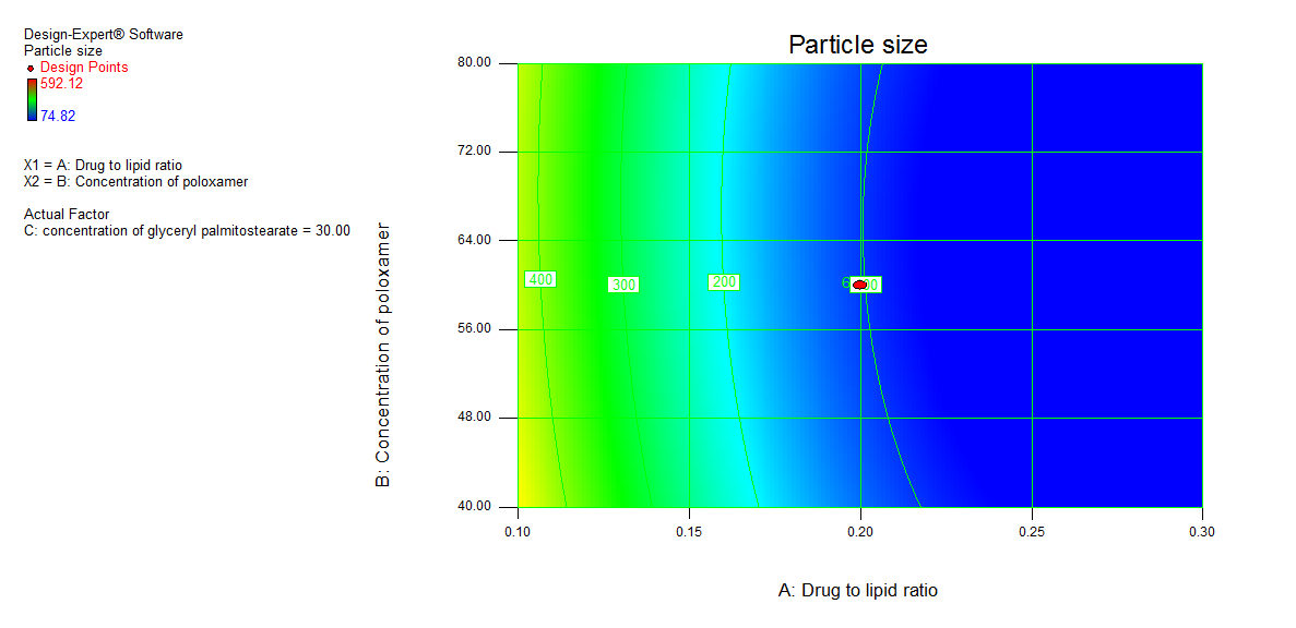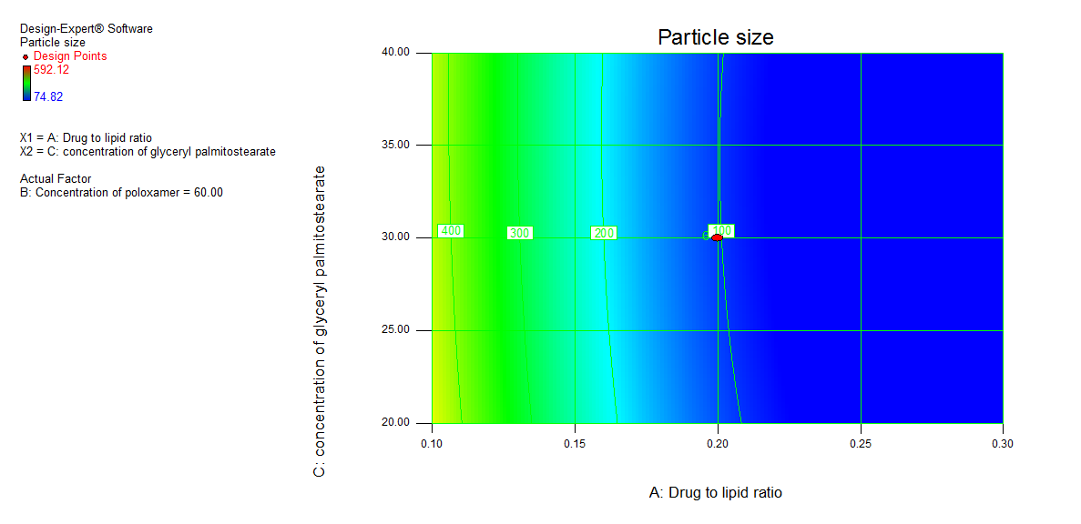 | Run | Drug to lipid ratio (A) | Conc. of poloxamer 188 (B) | Conc. of Glyceryl palmitostearate (C) | Particle size (Y1) | Encapsulation efficiency (Y2) |