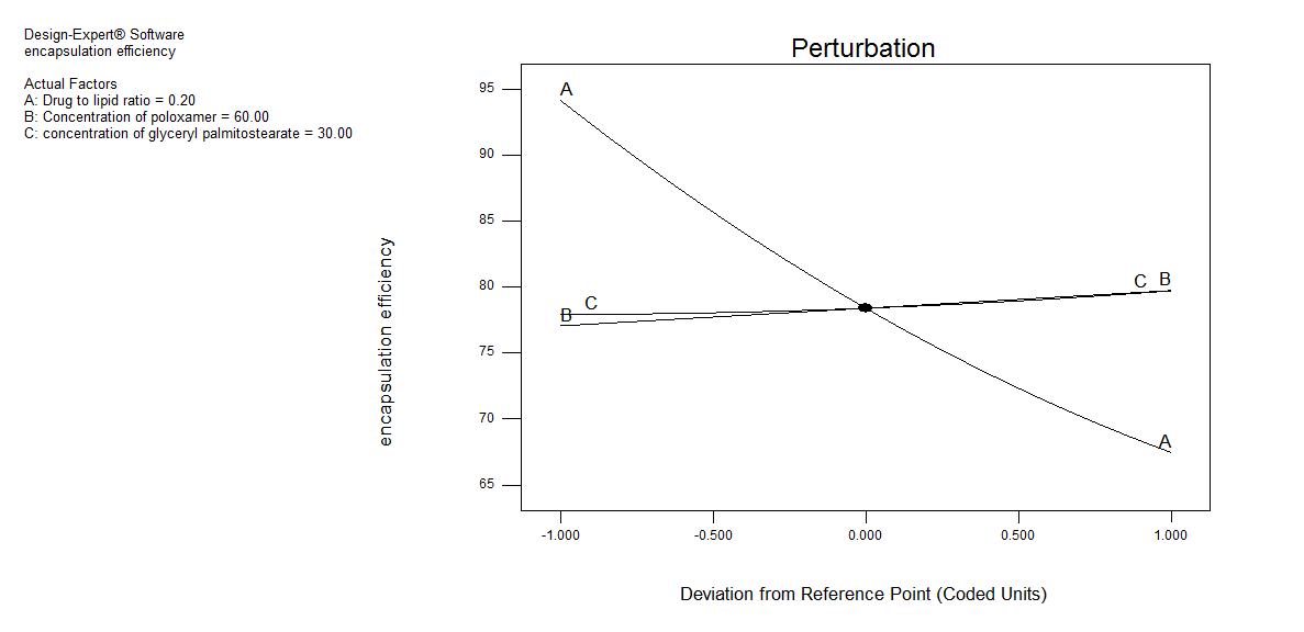 Fig. 3A: Perturbation plot showing the effect of A, B and C on % encapsulation efficiency