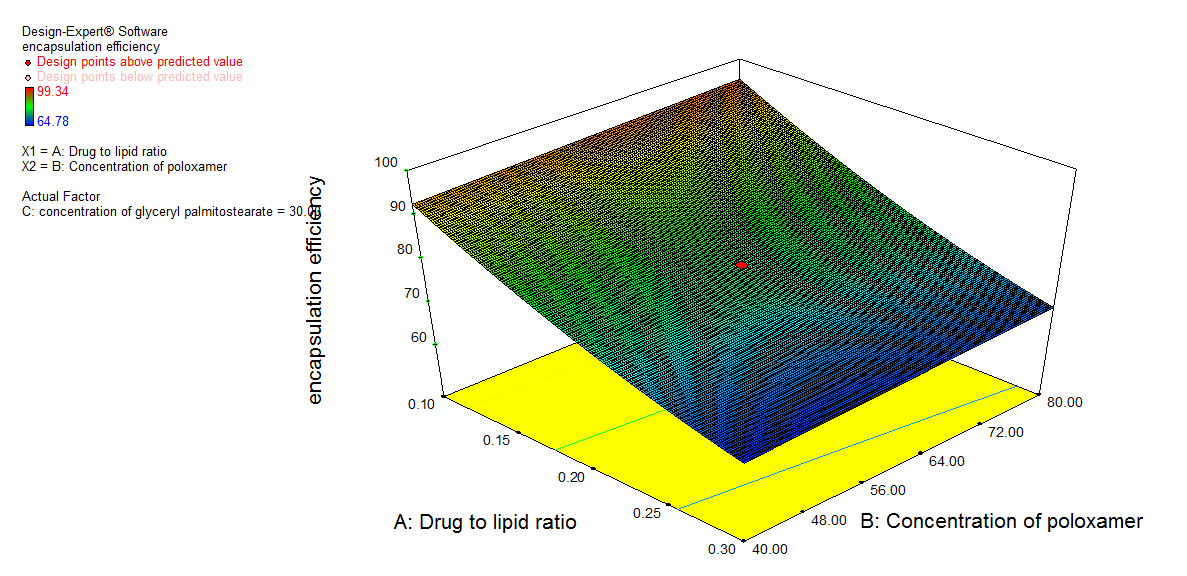 Fig. 3B: 3D-Response surface plot showing the influence A and B on encapsulation efficiency at constant level of C
