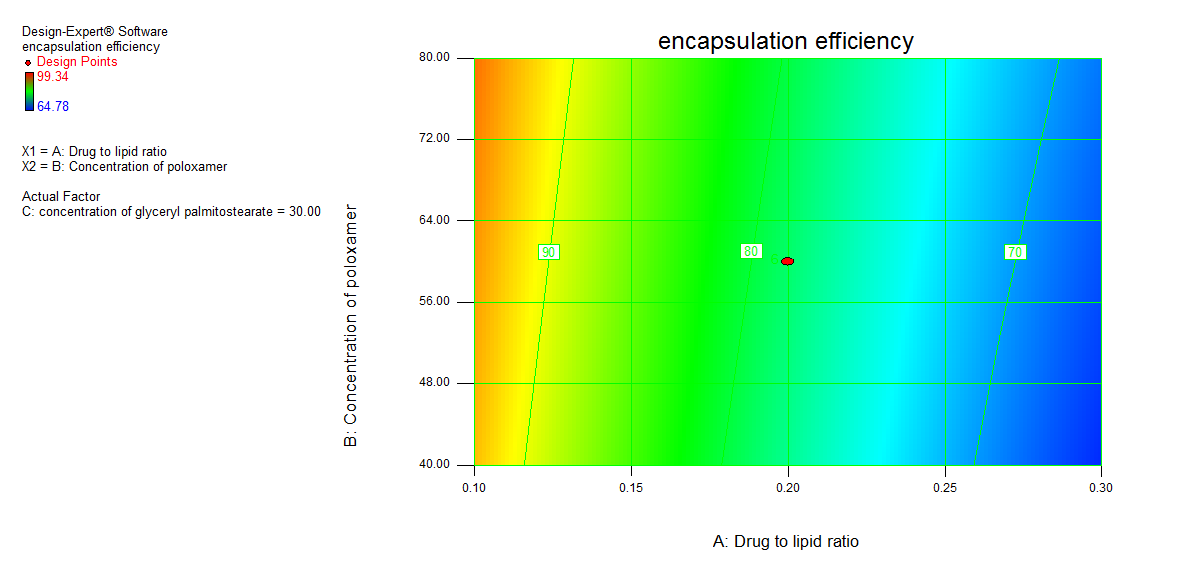 A numerical optimization method adopted with constraints like minimizing the PLS and to maximizing the ENE. Using the optimum settings, the SLNs with a desirability value of 0.691 was obtained. (table 4). For verification, 3 batches of SLNs were formulated in accordance with the predicted levels of A, B and C. Obtained Y1, and Y2 values were in good agreement with those of predicted. The results demonstrate the reliability of the optimization technique.