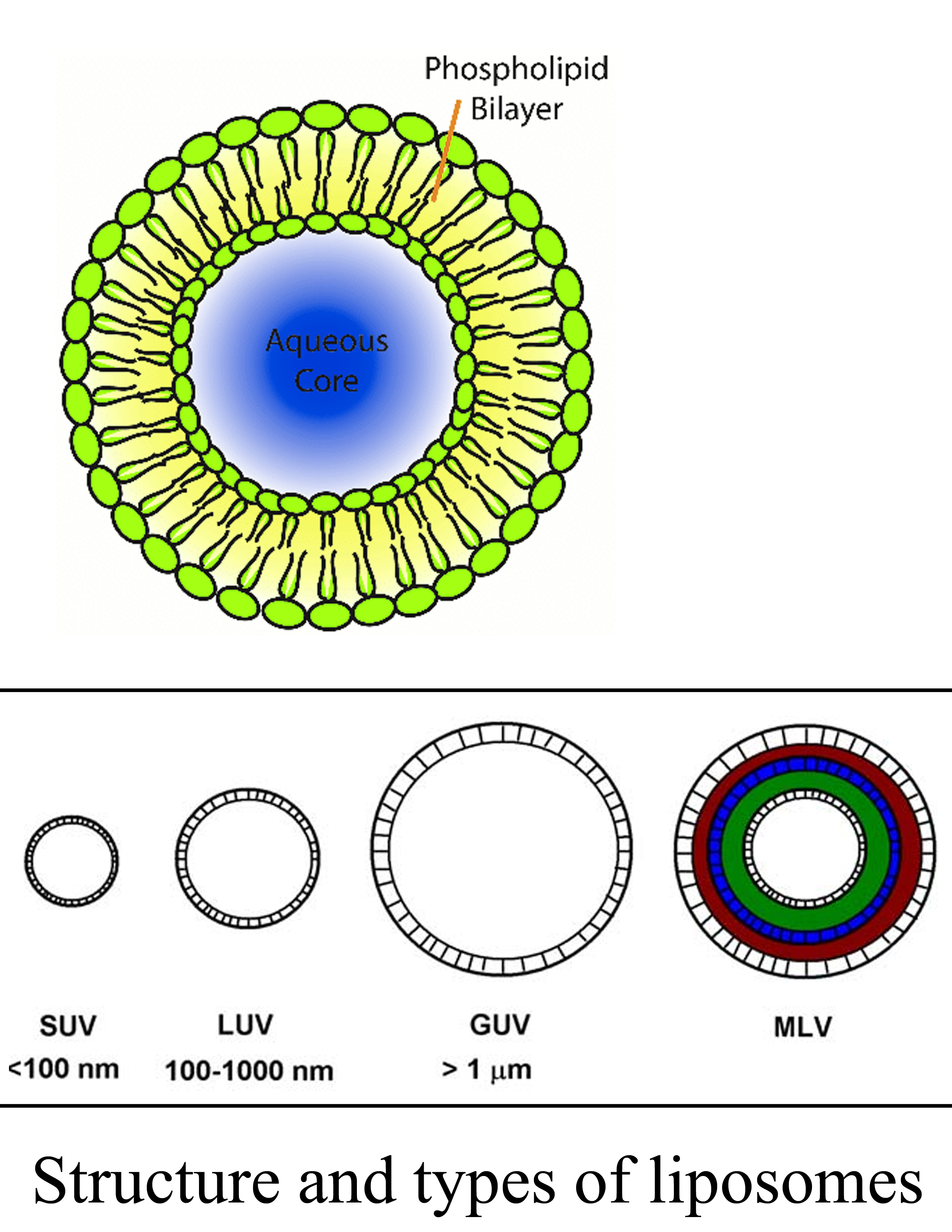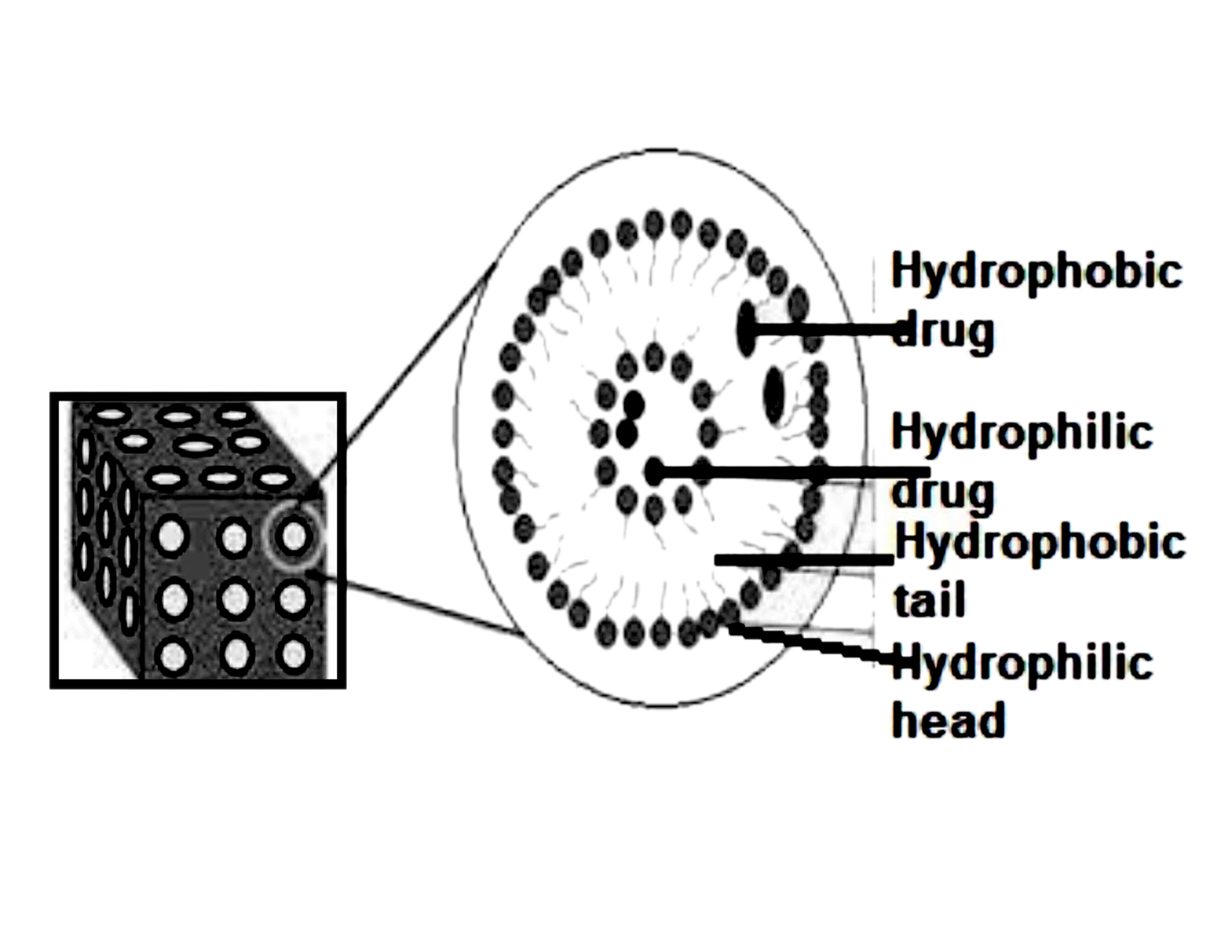 They are lipid-containing vesicular structures made of phospholipid bilayers entrapping an aqueous core [9]. Phospholipids are amphiphilic, having hydrophilic heads and hydrophobic tails. The hydrophilic section comprises more phosphoric acid bundled with water-soluble molecules, while the hydrophobic section comprises of two fatty acid chains. Liposomal structures are categorized according to their size and phospholipid bilayers. They can be labeled as small unilamellar (10-100 nm), large unilamellar (100-300 nm), and multilamellar (>300 nm). The existence of lipid layers and an aqueous core makes their structure unique and helps in the incorporation of both hydrophilic and lipophilic materials within the structure. The lipid membrane fuses with other cell membranes to discharge the material to supply the required drug molecules to the site, where it is to be utilized [10].