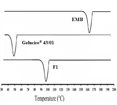 EMB's thermogram revealed the endothermic peak at about 163 °C, corresponding to its melting point and hence indicating its crystalline nature. The melting of Gelucire® 43/01 occurred at the peak at 44 °C. Lyophilized F1 indicated endothermic peak at 98.43 °C, which corresponds to the melting point of Gelucire® 43/01.