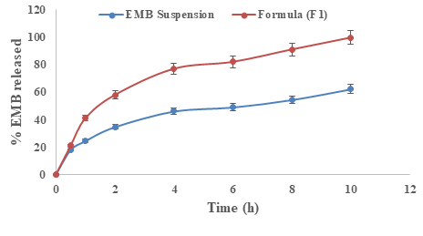 Fig. 3: In vitro release of EMB suspension and formula (F1)*, *Results are represented as mean±SD, n = 3