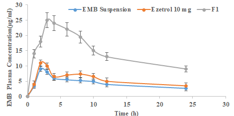 Animals were assigned to one of three random groups (n=3); Group I were given F1; Group II were given EMB dispersed in 2% carboxymethylcellulose as a blank drug [11] while Group III were given a commercial product (Ezetrol® 10 mg). The animals received only one oral dose of EMB at a rate of 25 mg/kg. A heparinized capillary tube was used to collect blood from the orbital sinus of rats at predetermined intervals. One-milliliter samples were placed in heparinized Eppendorf tubes and centrifuged at 12,000 rpm for ten minutes (Sigma Laboratory centrifuge, Germany). Plasma samples were placed and frozen at-20 °C till the time when they were analyzed by HPLC valid method.