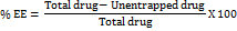 The size exclusion approach (Sephadex G–50 mini-column) was used to determine it. To expel and remove void volume containing SLN into the centrifuged tubes, 2 ml of SLN dispersion was poured dropwise on the top of the column and then centrifuged at 2000rpm for 2 min at room temperature (Remi Instruments Pvt. Ltd, India). The amount of entrapped drug was measured spectrophotometrically at λ max 271 nm (Shimadzu 1800, Japan) and the amount of eluted dispersion was lysed by disrupting with 0.1 % Triton X-100 [27-29].