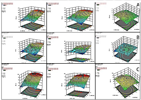 Because the optimization method only takes a few runs with three or four variables, a 15-run, 32 Box-Behnken design was used to generate polynomial models for the optimization process. This model could be used to investigate the quadratic response surface and build a second-order polynomial model using Design-Expert software (Trial Version10.1.6, Stat-Ease Inc., MN). The design consisted of replicated center points and a set of points located at the midpoints of each edge of the multidimensional cube, which defined the region of interest for evaluating the main effects, interaction effects, and quadratic effects of the formulation ingredients, as well as optimizing the formulation [14-17]. Table 1 shows the experiment design matrix created by the software.