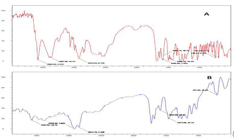 Fig. 2: FTIR spectrum of (A) Donepezil hydrochloride; (B) Donepezil hydrochloride solid lipid nanopArticle