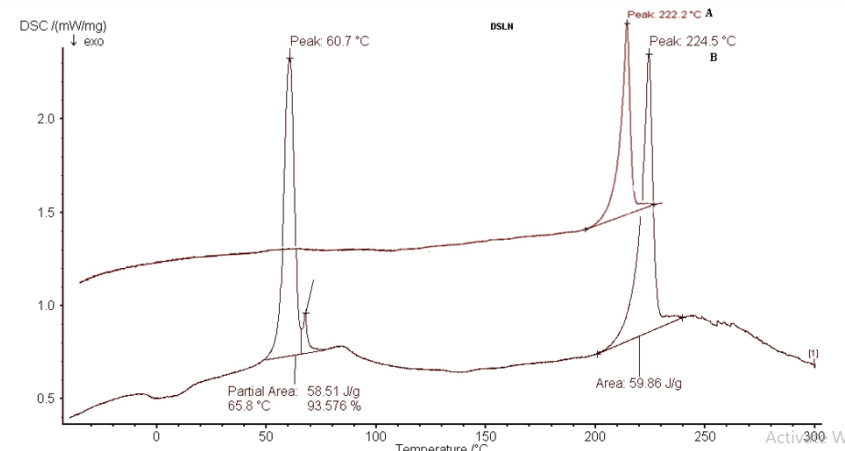 Donepezil (pure drug) and Donepezil SLN were studied using DSC to see if there was any difference in the drug's melting enthalpy, glass transition temperature, or interactions with ingredients. The research was conducted using a DSC Q1000 TA equipment. Approximately 2-5 mg of sample was deposited in standard aluminium pans and scanned in the range of 5 °C to above its melting point with a temperature increment speed of 10 °C/min under dry nitrogen (flow rate 50 ml/min) as effluent gas [19].