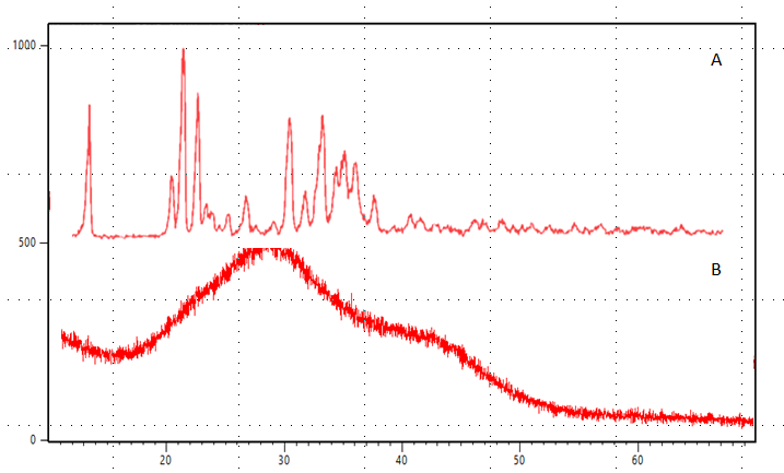 Fig. 4: XRD pattern of (A) pure donepezil drug; (B) coated optimized donepezil SLNs