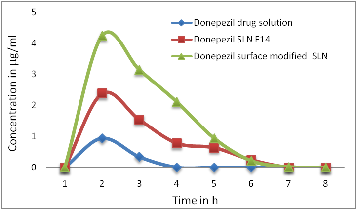 Pharmacokinetic study as shown table 8; fig. 8, was performed to understand the extent of bioavailability enhancement of Donepezil modified SLN in animals. Donepezil surface modified SLN showed improved bioavailability orally. Donepezil surface modified SLN shows maximum plasma drug concentration in oral route with slower drug elimination from body. Though Tmax for all formulations remained same the onset of action was found to be faster. The surface modified SLN shows good Cmax and AUC when compared to other two treatment groups. This data infers that there was a significant improvement of bioavailability of Donepezil Hydrochloride when it converted to surface modified SLN. Higher Cmax and improved bioavailability was also supported by behavioural changes observed in locomotor activity for surface modified SLN when compared to other treatment groups [26-28].