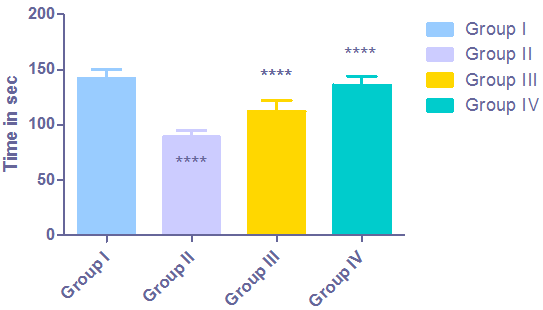 Psychosis was induced in animals by injecting Ketamine for 5 d. From the decreased locomotor activity and distorted movements it was confirmed that psychosis was induced. The locomotors activity was checked after 1.5 h of administration. It was found that, the locomotor effect of Donepezil surface modified SLN oral solution was more as compared to Donepezil SLN (F14) and Donepezil plain drug solution. Change in Locomotor activity (rat muscle coordination activity) by each group was statistically significant with a probability<0.001. From the statistically significant results it was concluded that effect of Donepezil surface-modified SLN was more when compared to Donepezil SLN (F14) administered by oral route. Muscle coordination assessed by the Rota rod apparatus were significantly deteriorated (p<0.05) in the ketamine induced group compared to the control as shown in fig. 8. When compared to the ketamine induced group, Donepezil SLN (F14) treatment group and Donepezil surface modified SLN showed better significant retention time (p<0.05) attributed to improvement in muscle coordination. Both treatment groups showed significant good muscle coordination when compared to ketamine induced group. Similarly, the locomotor score evaluated by Actophotometer was significantly diminished (p<0.05) in the ketamine group in comparison to the control group. This indicates the induction of oxidative stress and depletion in the neurons. Treatment with Donepezil surface modified SLN (p<.05) improved the locomotor score as compared to the diseased group as shown in fig. 9 [29-32].