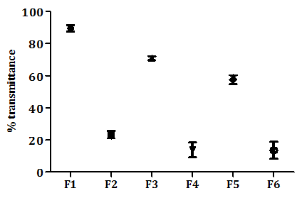 Fig. 2: The percentage of transmittance of Citronella oil microemulsions, the value was generated from triplicate measurements (as mean+SEM, n=3)