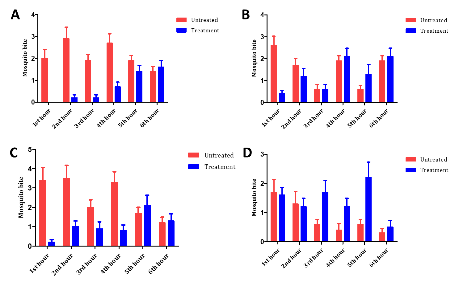 Fig. 3: The mosquito bite on the respondents’ hand, treatment with Product X (A); Citronella oil only (B); Citronella oil microemulsion; and empty microemulsion (without Citronella oil). n = 10, all values represent mean+SEM