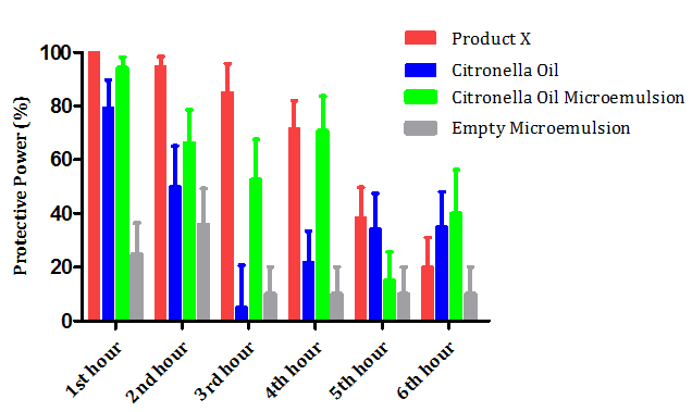 Fig. 4: The protection power of Citronella oil microemulsion as compared to Product X, Citronella oil only, and empty microemulsion (without Citronella oi). n = 10, all values represent mean+SEM