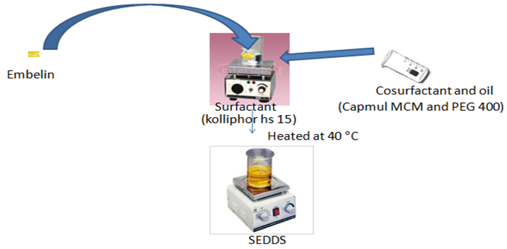 SEDDS were prepared by using the ratio of oil-Smix [Capmul MCM: Kolliphor hs 15: PEG 400(2:1)] and a pseudoternary phase diagram was prepared. Dissolving the drug in surfactant followed by addition of co-surfactant and oil in a beaker. The resultant mixtures were stirred continuously by magnetic stirrer and heated at 40 °C to obtain a homogenous mixture. SEDDS is also known as Emulsion preconcentrate because when it comes in contact with water, it will convert in to Emulsion [5].