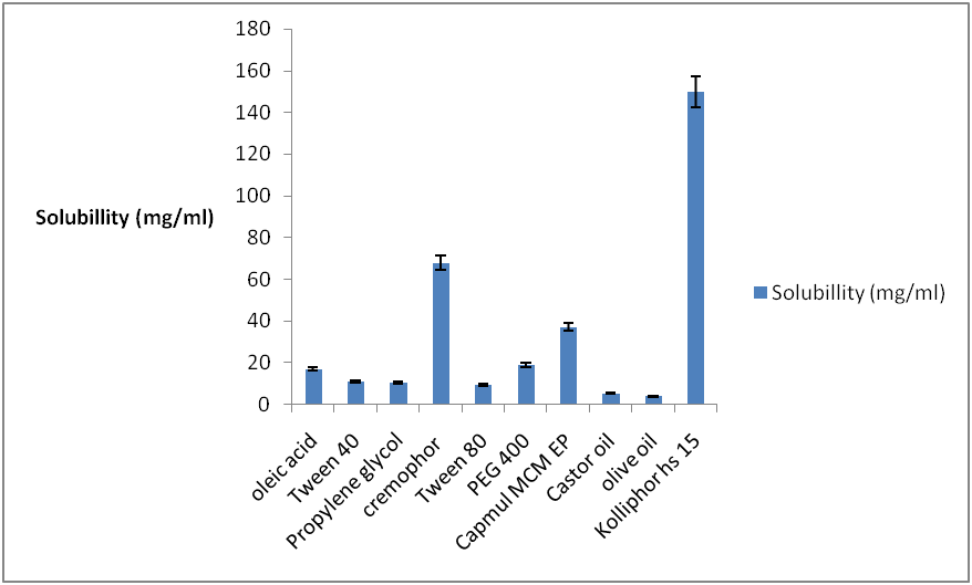Embelin was found to have highest solubility in Capmul MCM (oil), kolliphor hs 15 (surfactant) and PEG 400 (Cosurfactant). Fig. 2 shows the graphical representation of the saturation solubility of embelin in different oils, surfactants and co-surfactants and Data given in mean±SD, n=3.