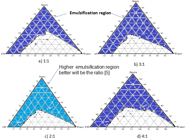 Self-emulsifying systems form fine oil-water emulsions with only gentle agitation upon their introduction into aqueous media. Surfactant and cosurfactant get preferentially adsorbed at the interface, reducing the interfacial energy as well as providing a mechanical barrier to coalescence. The decrease in the free energy required for the emulsion formation consequently improves the thermodynamic stability of the emulsion formulation [2]. Therefore, the selection of oil and surfactant, and the mixing ratio of oil to S/CoS, plays an important role in the formation of the emulsion. Screening of surfactant: the co-surfactant ratio was done on the basis of pseudoternary phase diagram using the water titration method. Table 4 and fig. 3 shows the screening of different ratios of surfactant: cosurfactant and pseudoternary phase diagrams prepared for different ratios of S: CoS i.e. from 1:1, 1:2, 1:3 and 1:4.