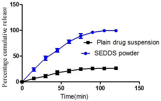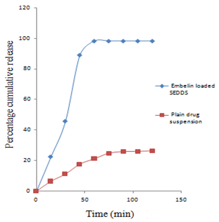 Percentage cumulative release was above 97% for embelin loaded SEDDS in phosphate buffer pH 7.4 while it was only 23 % in case of plain drug suspension in phosphate buffer pH-7.4 Significant increase in the rate of release of embelin from SEDDS compared to plain drug suspension can be attributed to its quick dispersibility and ability to keep drug in the solubilized state.