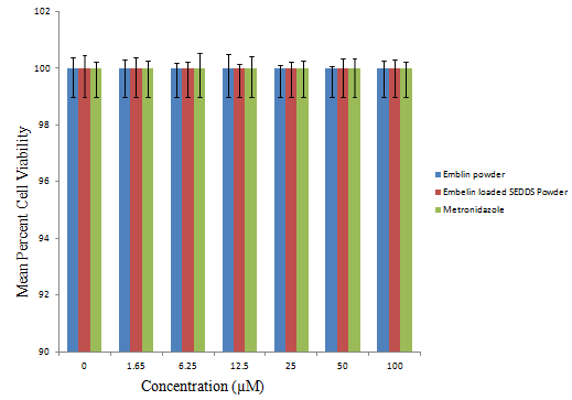 To examine the effect of antiamoebic formulation plain drug suspension, embelin loaded SEDDS powder and metronidazole on cell proliferation; we studied their cytotoxicity on human breast cancer MCF-7 cell line. A subconfluent population of MCF-7 cells was treated with increasing concentrations of compounds and the number of viable cells was measured after 48 h by MTT cell viability assay based on mitochondrial reduction of the MTT tetrazolium dye to a highly coloured blue formazone product. This assay usually shows high correlation with number of living cells and cell proliferation. The concentration range for all the formulations was 1.56-100 mmol. Fig. 4.20depicts the formulation i. e Plain Drug Suspension, embelin loaded SEDDS powder and metronidazole exhibited 100% viability at the concentration range of 1.56-100 mmol These results mean that Plain Drug Suspension, Embelin loaded SEDDS powder and Metronidazole were nontoxic against the human breast cancer MCF-7 cell line.