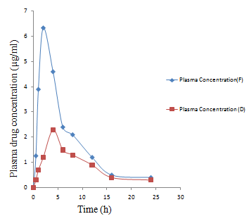 Fig. 11: Plasma concentration time curve following oral administration of Embelin plain drug suspension (D) and Embelin loaded SEDDS formulations (F) groups of guinea pig. Data expressed as mean±SD; * p<0.05 statistically significant (n=6)