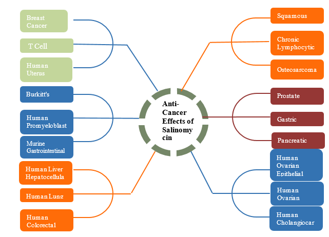 Fig. 2: Salinomycin's anticancer effects on numerous cancer types are summarized