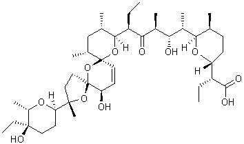 | IUPAC | (2R)-2-[(5S,6R)-6-[(1S,2S,3S,5R)-5-[(2S,5R,7S,9S,10S,12R,15R)-2-[(2R,5R,6S)-5-ethyl-5-hydroxy-6-methyl-2-tetrahydropyranyl]-15-hydroxy-2,10,12-trimethyl-1,6,8-trioxadispiro[4.1.5^{7}.3^{5}]pentadec-13-en-9-yl]-2-hydroxy-1,3-dimethyl-4-oxoheptyl]-5-methyl-2-tetrahydropyranyl]butanoic acid | |