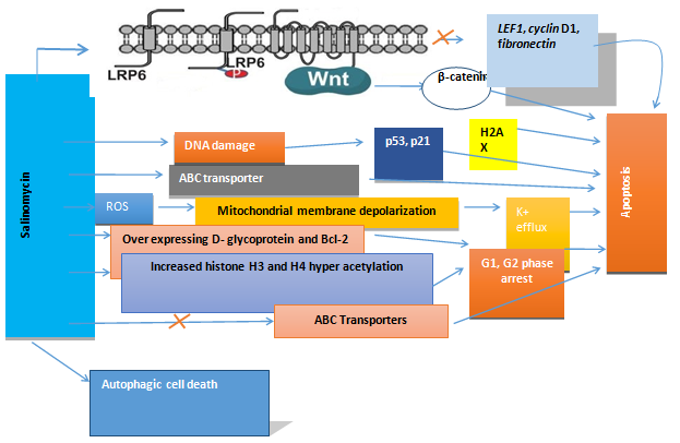 CSCs have been discovered at a wide range of humanoid malignant cancers, that consists of blood, breast, brain, bone, skin, liver, lung, bladder, ovary, prostate, colon, pancreas cancers, states that physiological proliferative tissues, been hierarchically prepared and broadcasted by a small number of stem cells [60]. CSCs are cells inside a tumor that may self-renew and result in many extractions of cancer cells that make up the tumor. CSCs can be identified experimentally in repeated xenotransplantation procedures by their capacity to boost the growth of a growing tumor. Although it is questionable if tumorigenic cells recovered from hematological and solid tumors based on the manifestation of particular cell surface indications are the true "stem cells" of the tumor. Salinomycin is more effective than paclitaxel, the conventional chemotherapeutic medication for the treatment of BCSCs [61]. Salinomycin causes BC mammosphere cells to apoptosis, which is associated with Bcl-2 expression downregulation and lowers their migration potentially, which is accompanied by c-Myc and Snail expression downregulation [62]. Salinomycin inhibits mammosphere development, induces cell death, and inhibits cell proliferation in BC cells through influencing stem cell signaling, such as Wnt and Hedgehog signalling, or ALDH1 activity [63–65]. Although the specific processes governing salinomycin's actions on BCSCs are unknown, the current review has given insight on its molecular mechanisms of action of salinomycin, underlying eradication of CSCs as shown in fig. 5.