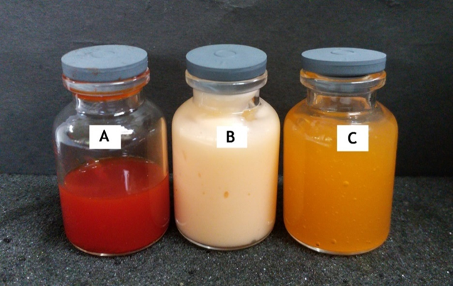 Fig. 4: Physical appearance of (A) red fruit oil nanoemulsion, (B) nanoemulsion cream, and (C) nanoemulsion gel