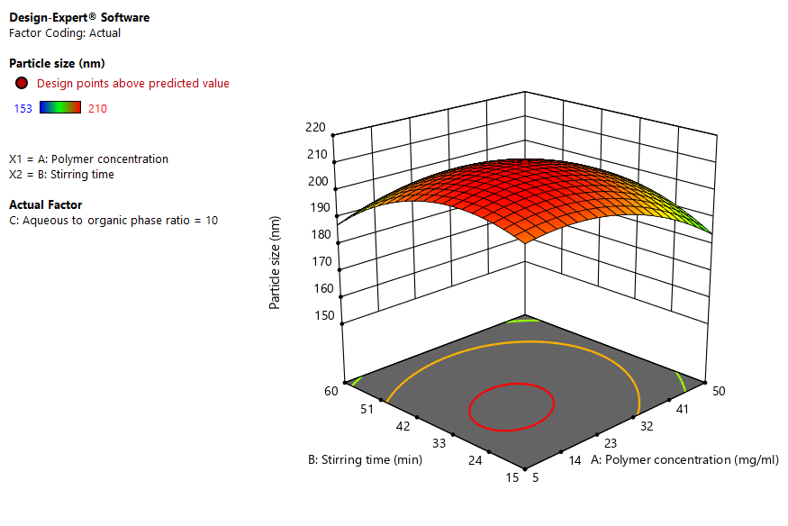 Fig. 1: Three-dimensional (3D) response surface plots showing the effect of the variable on response. The effect of polymer concentration and stirring time on particle size