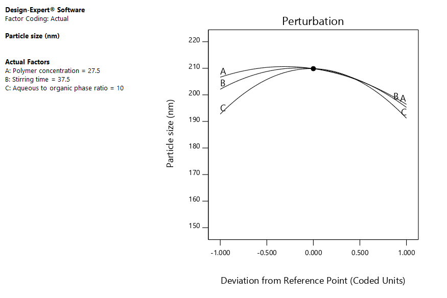 The CCRD–RSM constitutes an alternative approach because it offers the possibility of investigating a high number of variables at different levels with only a limited number of experiments. The variables in table 1 were picked considering our initial experiments. Table 2 revealed the speculative outcomes concerning the evaluated variables on drug encapsulation efficiency, mean particle size, and also zeta potential. The three dependent values varied from 68 to 94 % by weight, 153 to 210 nm, as well as-35 to 31 mV. A mathematical relationship between factors and also parameters was produced by response surface regression evaluation making use of Design-Expert ® 11 software application. The three-dimensional (3D) response surface graphs for the most statistically significant variables on the evaluated parameters are displayed in fig. 1-3. The response surface diagram revealed that the mean particle size, zeta potential, and encapsulation efficiency were enhanced with an increase in polymer concentration. An increase in the stirring time and decrease in the polymer concentration decreases the particle size. As well, increasing in stirring time and an increase in polymer concentration increases the zeta potential. An increase in polymer concentration and aqueous to organic phase ratio increases the encapsulation efficiency. The optimized variables revealed an excellent fit to the second-order polynomial equation. After model simplification with backward elimination, the r-value decreased a little to 0.9545, 0.5866 as well as 0.7280, respectively. The lack of fit was not significant at a 95% self-confidence level. All the remaining parameters were significant at p ≤ 0.05. The statistical analysis of the results produced the adhering to polynomial equations and is also provided in table 3. Anticipated optimum ranges of the independent variables are detailed in table 4. The fitting outcomes showed that the optimized nanoparticles with high entrapment efficiency, minimal particle size as well as ideal zeta potential was acquired with the polymer concentration of 50 mg/ml, stirring time of 60 min as well an aqueous to organic phase ratio of 5:1 v/v, respectively. Table 4 programs that the experimental values of both sets prepared within the optimum range were extremely near to the anticipated values, with low percent bias, recommending that the optimized formulation was trustworthy and also sensible. It can be ended that a high desirability value might be gotten with a polymer concentration of 50 mg/ml, stirring time of 60 min as well an aqueous to organic phase ratio of 5:1 v/v. The desirability acquired was 0.740 and also the same is represented in fig. 4. Perturbation plots exist in fig. 5-7 for anticipated models to get a much better understanding of the examined treatment. These sorts of plots reveal the impact of an independent factor on a particular response, with all various other aspects held consistent at a referral factor. A steepest incline or curvature suggests the sensitiveness of the response to a specific factor. Fig. 5 shows that stirring time had one of the most crucial impacts on particle size followed by polymer concentration and aqueous to organic phase ratio. Fig. 6 shows that stirring time had one of the most vital impacts on zeta potential, followed by polymer concentration and aqueous to organic phase ratio. Fig. 7 reveals that the aqueous to organic phase ratio had the most crucial result on encapsulation efficiency, followed by stirring time and polymer concentration.